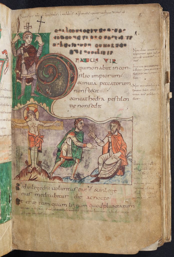 In the hands of the Stuttgart illuminator, the first letter of the first word of the Psalter expresses a whole theological universe in miniature. The “b” in “blessed” (beatus) is composed of the upright form of King David and a growing, curling vine. At one level, then, David himself is the “blessed man” Psalm 1 calls us to behold, whose vibrant life with God causes new growth to spring up like verdure covering once-barren earth. Since the whole Psalter was traditionally thought to have been composed by David, every word in the book is both an effect of David’s blessing and a means by which the one who prays the psalms enters into David’s gifts.